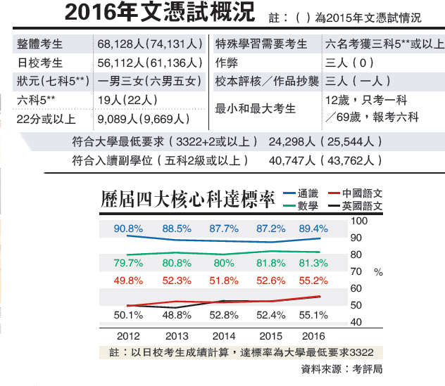 考评局昨日公布2016年文凭试成绩数据。考评局秘书长唐创时表示,今年有57,127名日校考生及11,001名自修生,整体考生人数较去年整体大幅减少8%。今年有24,298名考生符合3322+2,即中英文科3级,以及数学、通识和一科选修科2级,符合入读八大的最低资格,占整体考生36.3%,较去年上升1.2个百分点,他们将争夺约1.5万个大学联招(JUPAS)学额,平均1.6人争一学位,竞争比率是历年最低,但仍有9,000多名达标考生无缘跻身八大院校。此外,整体有40,747名考获五科2级(包括中英两科)或以上成绩,约占整体考生70.5%,比率较去年增加1.6%,将符合报读副学位课程或应徵公务员职位的基本要求。