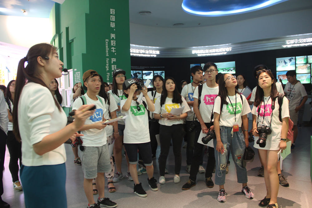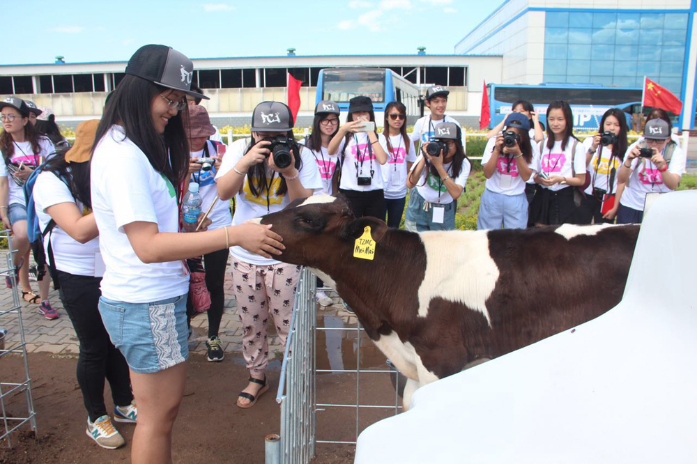 12日,港学子参观内蒙古伊利集团,和小牛亲密接触/大公报记者 刘舒婷摄