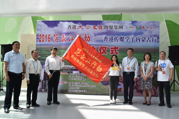 范长江行动─香港传媒学子内蒙古行启动礼12日在内蒙古呼和浩特伊利集团举行。采访团团长、香港大公文汇传媒集团董事姜亚兵(右三)、内蒙古自治区党委宣传部外宣办副主任陈宝泉(左三)在启动礼上向学生代表何咏雯(中)授旗,内蒙古自治区团委统战联络部调研员、青联副秘书长赵轩(左一),呼和浩特市委宣传部副部长、外宣办主任韩丽(右二),伊利集团副总裁蔚林聪(左二)等出席/大公报记者冯玥摄