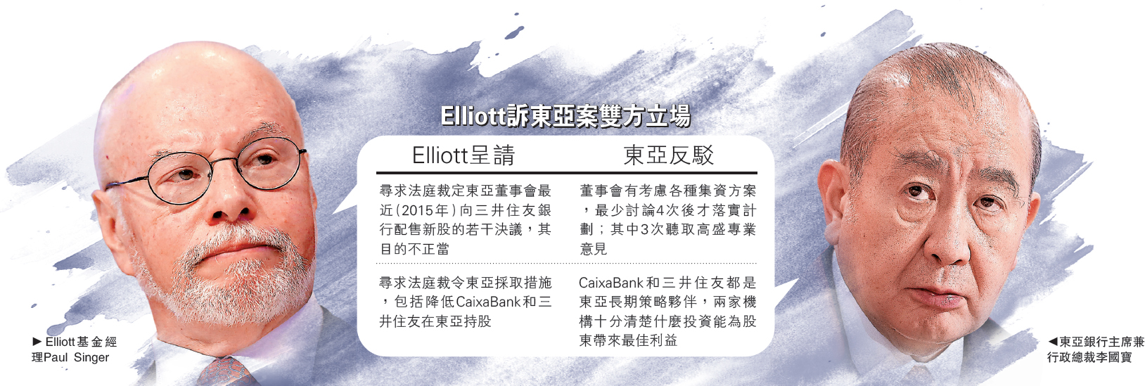 去年2月,Elliott曾入禀法院,指东亚与三井住友签订的配股协议会摊薄股东权益,质疑是否有需要配股,并要求东亚交出董事会有关配股决定的文件。Elliott的申请其后获高院批准。