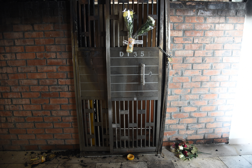 大公网7月18日讯 港岛西区观龙楼四死纵火惨剧,涉事两个单位昨日重门深锁,屋内满目疮痍仿如废墟,其中惨死一家三口的单位傢俬烧成焦炭,墙身批盪剥落燻黑,怀疑纵火的独居精神病汉,曾有伤人案纪录。火警中受影响的住户均表示犹有馀悸,希望当局安排同邨调迁。