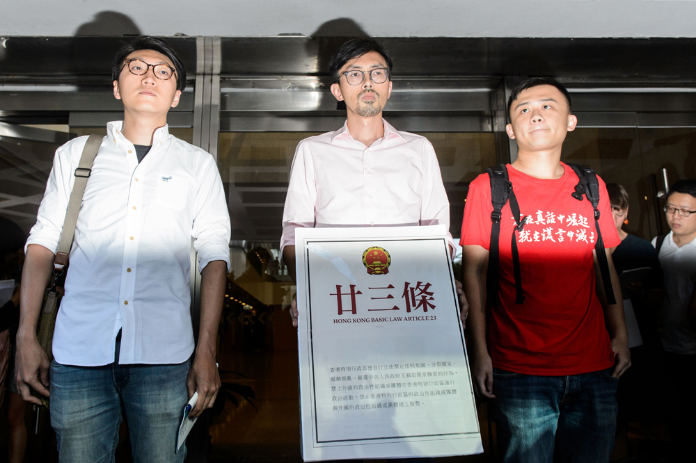 图:提出司法覆核的本民前梁天琦(从左至右)、社民连吴文远、陈德章三人昨日离开香港高院后接受传媒采访 法新社