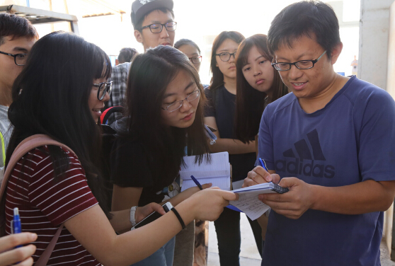 图:张永亮(右)向港生介绍自己的创业经历\大公报实习记者郑云风摄