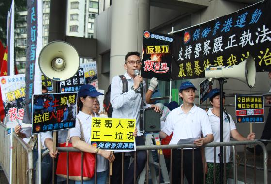 保卫香港运动约20名成员昨日在东区裁判法院外集会,高举印有支持警察严正执法,严惩暴徒还我法治等标语的横额,谴责本土民主前线黄台仰、梁天琦等人发起旺角暴乱,并认为他们须为自己的行为负上法律责任。