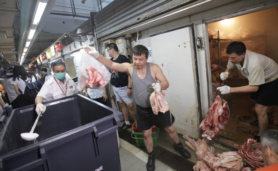 图:食环署人员到上环街市销毁约1000公斤怀疑有问题猪肉\大公报记者林少权摄
