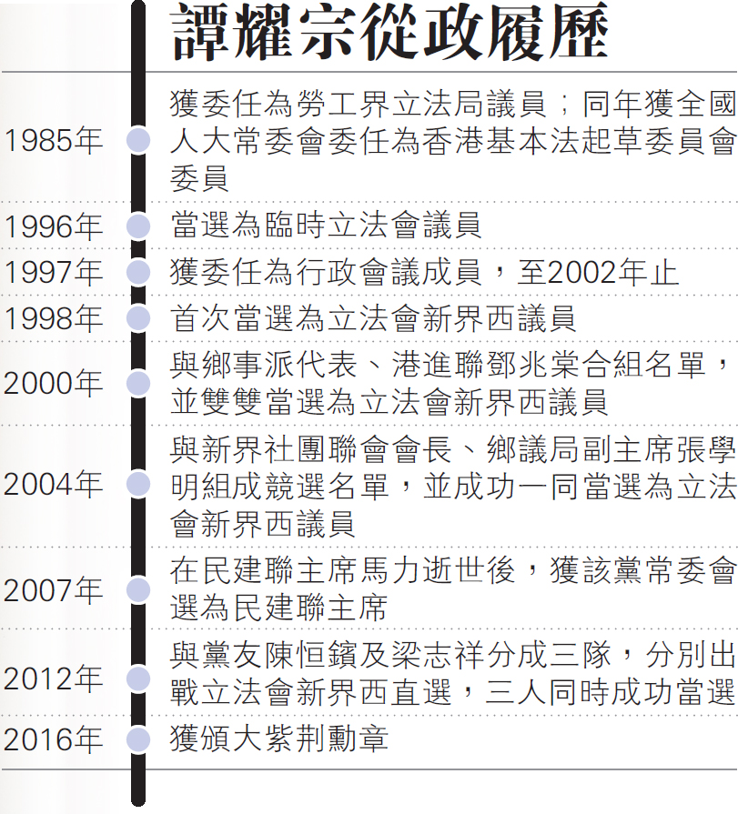 民建联立法会议员谭耀宗从政30多年,但他指,这其实并非自己一直追求,只是机缘巧合下有机会为社会服务,坦言这些年从政生涯有苦有乐,但综观是感到幸福和幸运。