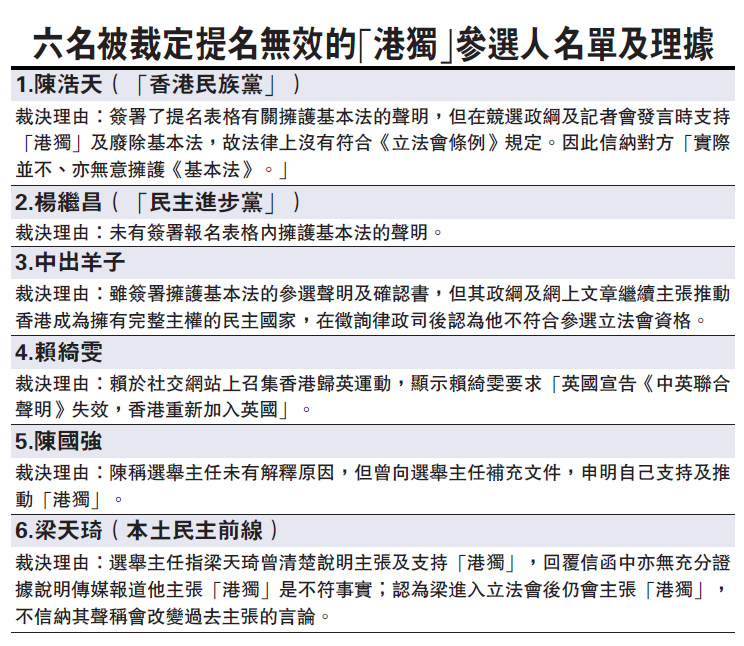 本土民主前线的梁天琦昨被选举主任决定提名无效,政界人士认为,选举主任的决定是合法、合情和合理,完全是按基本法办事,并认为梁天琦所谓不会推动港独,只是讲一套、做一套,他其后扬言搞革命,説明选举主任的决定是正确。