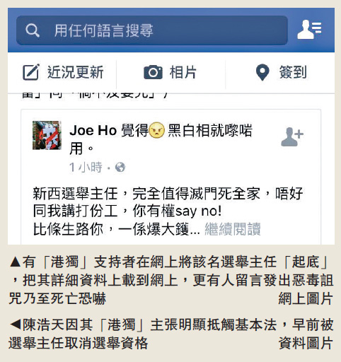 大公网8月2日讯(记者龚学鸣)香港民族党陈浩天因其港独主张明显抵触基本法而被选举主任取消选举资格。有港独支持者在网上将该名选举主任起底,把其详细资料上载到网上,更有人留言发出恶毒诅咒乃至灭门恐吓。特区政府昨日发表声明,强调有关言行不能接受,并表示警方高度重视事件,会依法採取适当的行动。私隐专员黄继儿表明,取自公共领域的个人资料受《个人资料(私隐)条例》规管,促有关人士尊重他人私隐。亦有法律意见指出,网民的言论或涉及恐吓成分,有机会触犯刑事罪行。