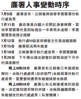 大公网7月30日讯(记者陈卓康)廉政公署高层昨日在一天内发生峰回路转的人事变动,刚于不足两星期前接替李宝兰署任执行处首长的丘树春,昨日突然申请提前解约,但执行处同事强烈挽留,丘考虑廉署整体利益,两小时后决定撤回解约申请,获一直挽留他的廉政专员白韫六接纳。一度要接替丘树春的执行处处长(政府部门)余振昌继续原职,而廉署出身的监警会秘书长朱敏健则回巢出任执行处处长(私营机构)。