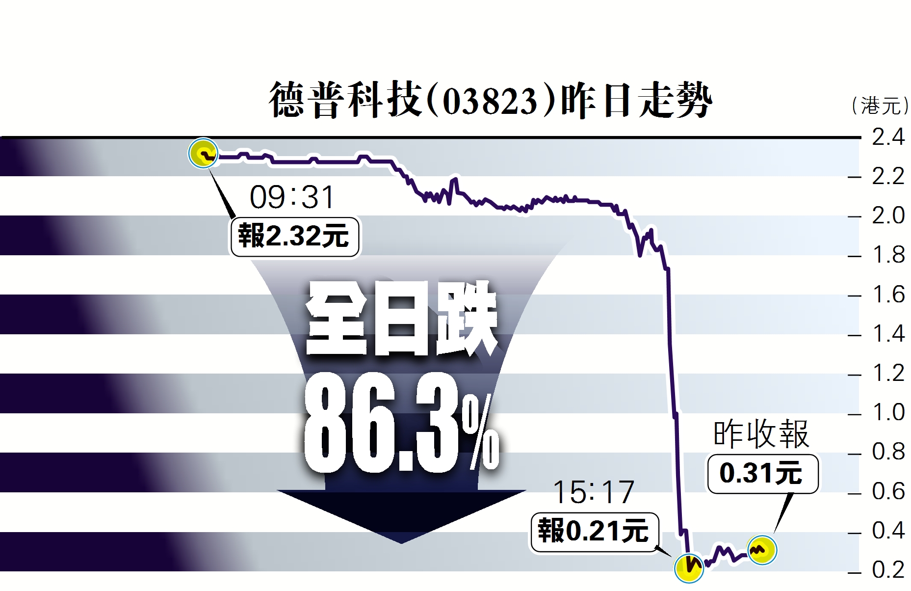 从事制造及销售LED照明产品业务的德普继上月被投资机构GeoInvesting指控财务不足难以营运后,昨日又被Glaucus发表报告,认为公司虚报财务资料,夸大子公司的盈利以及收购物业的作价,并多次引述国家工商总局资料作为证据。该报告发表后,公司股价已先跌一成,及后于下午3时起,17分钟内股价由1.85元,大插至0.218元,跌幅达85%,即每分钟市值蒸发逾6亿元。