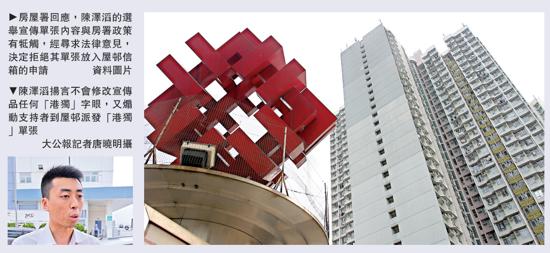 支持港独的立法会候选人、东九龙社区关注组陈泽滔称接获东汇邨及沙田坳邨的屋邨办事处来电,指收到房屋署指示,不让其印有港独字眼的宣传品进入屋邨。陈泽滔扬言不会修改宣传品任何港独字眼,又煽动支持者到屋邨派发这批港独单张。房屋署发言人回应,由于宣传单张内容可能与房屋署的政策有牴触,考虑到法律意见后,和按照房屋署的政策,所以决定拒绝其申请。/大公报记者 冼国强