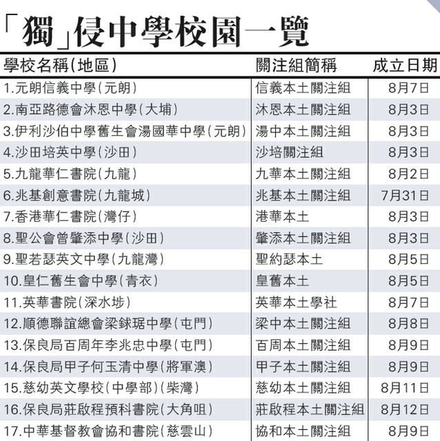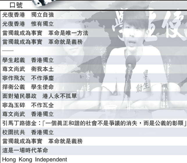 本报去年揭发教协举办中学生好书龙虎榜竟出现倡议港独的《香港城邦论》。记者注意到,近期港独组织更加紧在校园播独。本土民主前线的门徒学生动源扬言要于全港中学推动成立本土关注组,并于新学年以标榜港独来参选学生会,并在校内外派发传单宣传港独,半个月来所谓的本土关注组,已蔓延至17所中学。