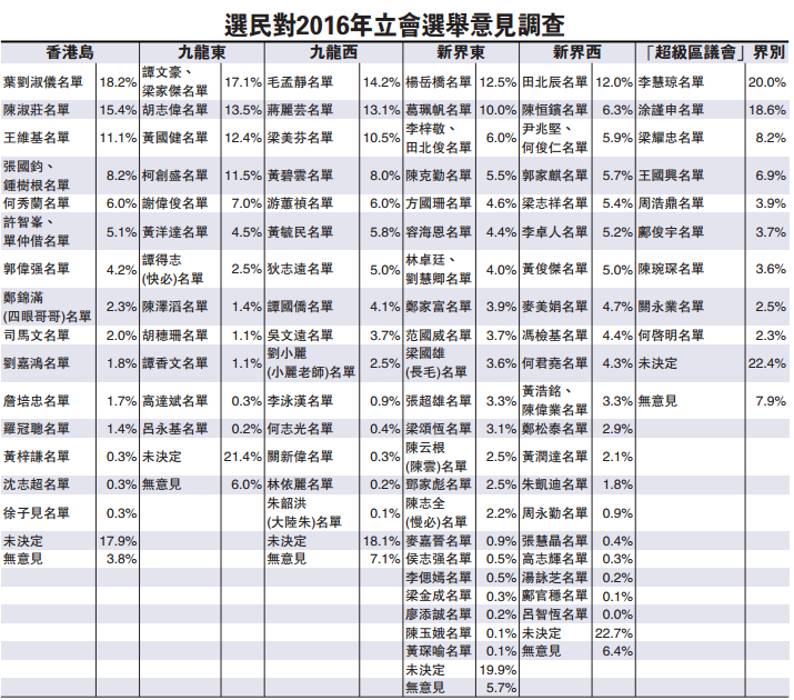 至于市民对各区候选人的投票意向方面。港岛方面,新民党叶刘淑仪获最多支持,占18.2%。末席竞争激烈,由民主党许智峯及工联会郭伟强竞逐。前者仍然占优,有5.1%,反而郭伟强只有4.2%。九龙东方面,公民党谭文豪、民主党胡志伟、工联会黄国健及民建联柯创盛较大机会取得一席,最后一席则由独立的谢伟俊及热血公民黄洋达竞争,现时谢只是领先2.5%,情况相当严峻。