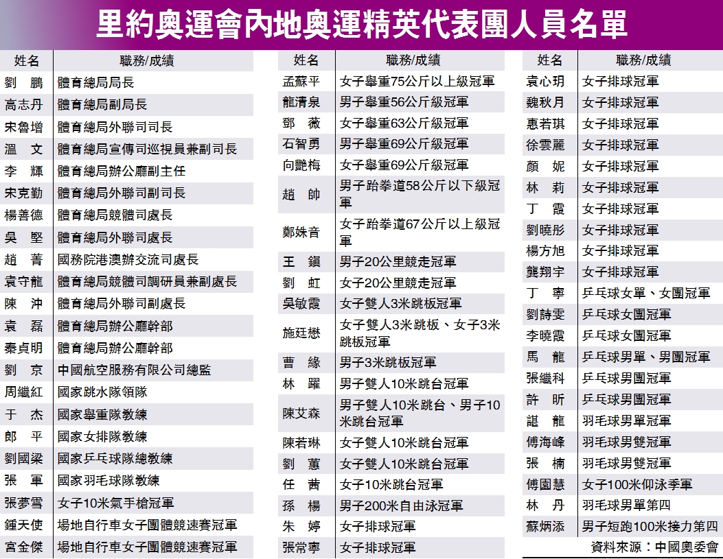 大公网8月24日讯(记者叶汉亮)里约奥运会内地奥运精英代表团将于本周六抵港,由中国奥委会提供的64人代表团名单已经敲定,除了在奥运夺得金牌的运动员,还有三名虽失落金牌、但依然深受港人欢迎的运动员,包括洪荒少女傅园慧、羽毛球名将林丹、有份缔造中国田径新佳绩的苏炳添。带领中国女排重夺奥运金牌的国家队教练郎平,将与一众中国女排成员随团来港。行政长官梁振英表示,香港得到国家支持,访港的内地奥运精英代表团将与市民见面和参加各种互动活动。