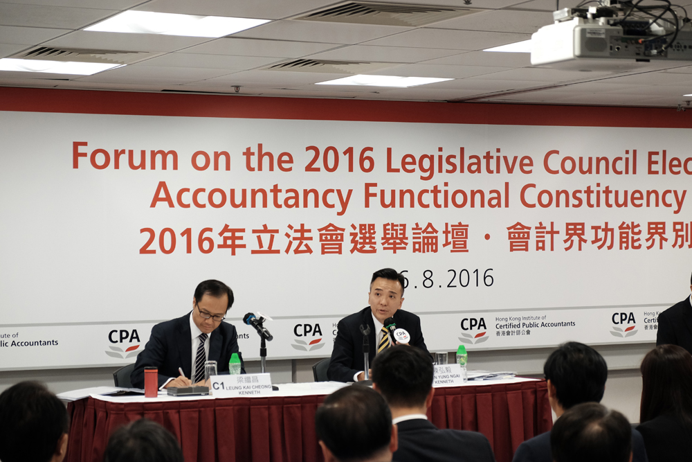 图:陈弘毅(右)和梁继昌(左)昨天出席会计界选举论坛 大公报记者冯瀚林摄