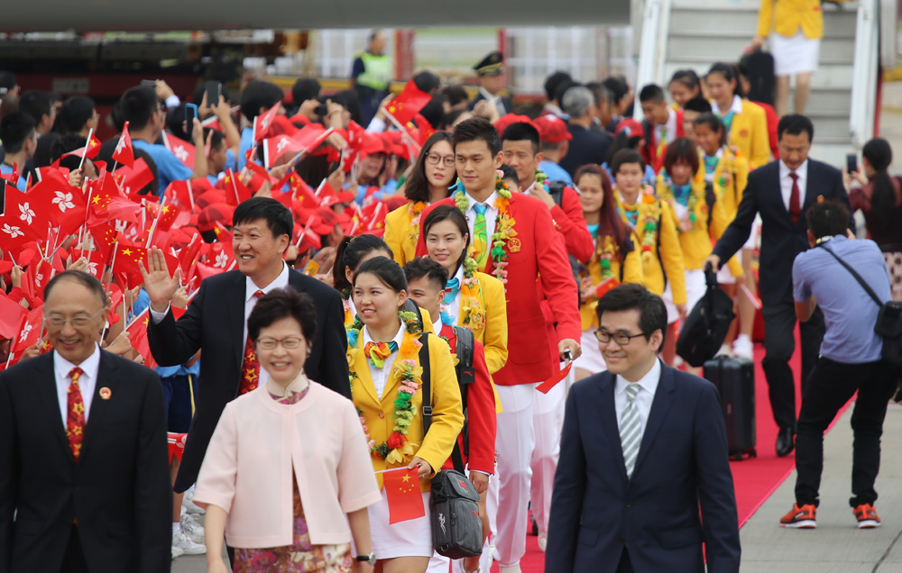 国家奥运队精英在一片热烈欢迎的气氛中抵港,展开为期三天的访港行程。 大公报记者何嘉骏摄