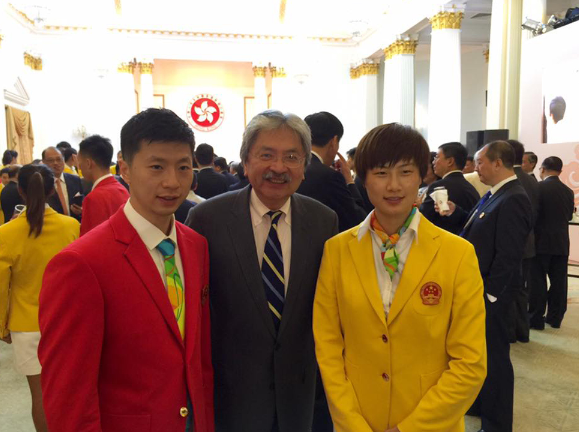 图:曾俊华(中)在欢迎国家运动员的酒会上与马龙(左)、丁宁(右)合影
