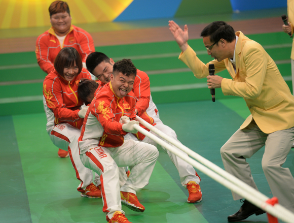 力拔山兮气盖世!第一个节目由龙清泉、石智勇、邓薇、向艷梅、孟苏平五名举重运动员与50名小朋友拔河较劲。力士队五人排成传统的一条直线,而小朋友则两边拉开,与对手形成一个丫字。比赛限时30秒,一开始掉以轻心的力士队上来就吃了大亏,后来全力施为,仍然被缓缓拉动,最终大意失荆州,战胜奥运冠军的小朋友们自然欢呼雀跃不已。