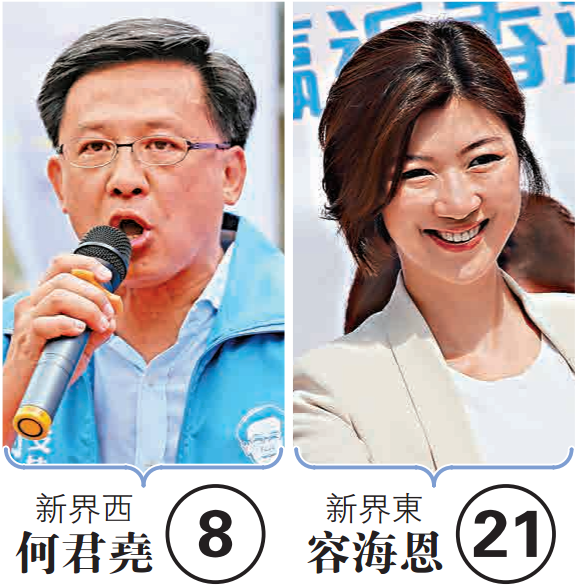 新界东候选人还有:葛佩帆、陈克勤、邓家彪、容海恩、李梓敬、方国珊、林卓廷、杨岳桥、张超雄、侯志强、梁国雄、陈志全、麦嘉晋、廖添诚、黄琛喻、陈云根、陈玉娥、李偲嫣、梁颂恒、梁金成。新界西候选人有:梁志祥、陈恒镔、麦美娟、田北辰、周永勤、何君尧、尹兆坚、郭家麒、黄俊杰、冯检基、黄润达、朱凯迪、黄浩铭、李卓人、汤咏芝、张慧晶、高志辉、郑松泰、吕智恒、邝官稳。