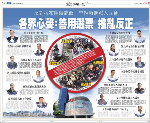 前副廉政专员郭文纬提到,《大公报》早前揭露本土民主前线发言人梁天琦和黄台仰的奢华生活,质疑两个无业的年轻人出来搞港独,与美国领事馆秘密会面,买车、住贵价公寓,为何却从没有其他传媒质问他们到底钱从何来。郭文纬不排除部分团体及传媒收了黑金,做了外国势力棋子,并故意将小事无限放大,目的是搞乱香港,在全球制造舆论贬低中国、香港及一国两制,遏制中国发展。选举前夕,郭文纬认为此役将决定未来四年,香港究竟要和谐建设或抗争破坏,呼吁选民为香港未来和下一代着想,踊跃投票,制止激进泛民和本土派继续破坏香港。