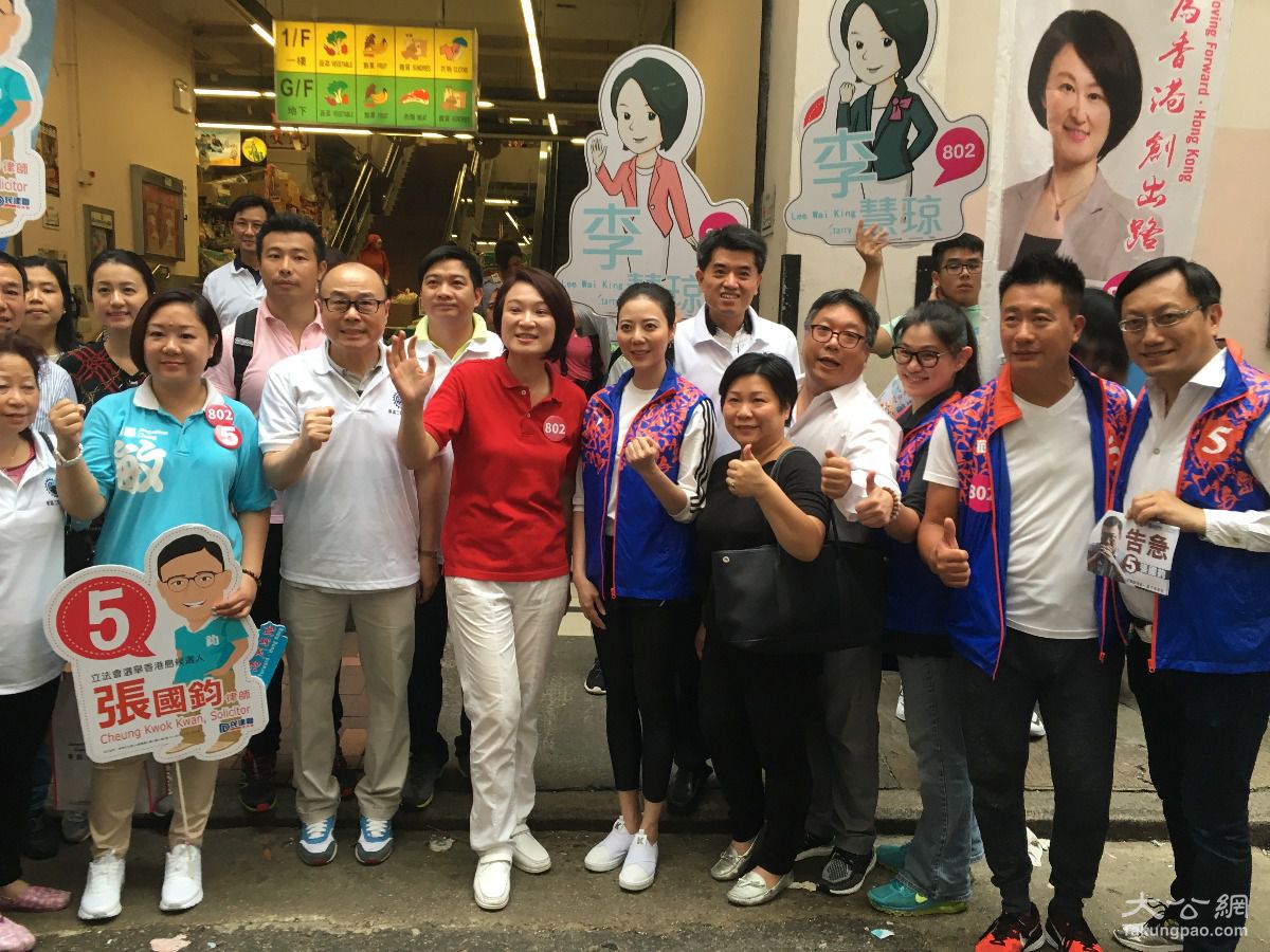 民建联参选 超级议席 的李慧琼(前排立右三)和参选港岛选区的张国钧(前排立左三)团结奋战。 大公报记者文轩/摄