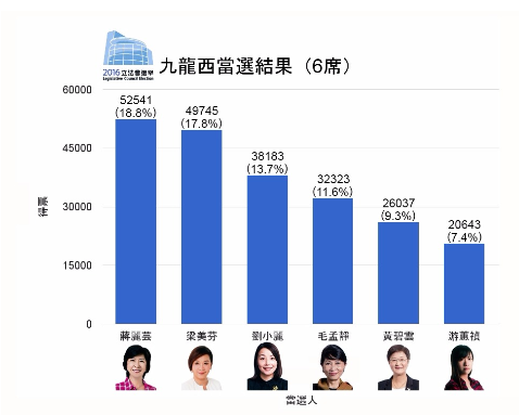 大公网9月5日讯 (记者钱纪廷)据香港政府新闻处消息,立法会换届选举九龙西选区有结果,当选的分别为蒋丽芸,得票为52541票;梁美芬得票为49745;刘小丽得票为38183票,毛孟静得票为32323票,黄碧云得票为26037票,以及游蕙祯得票为20643票。