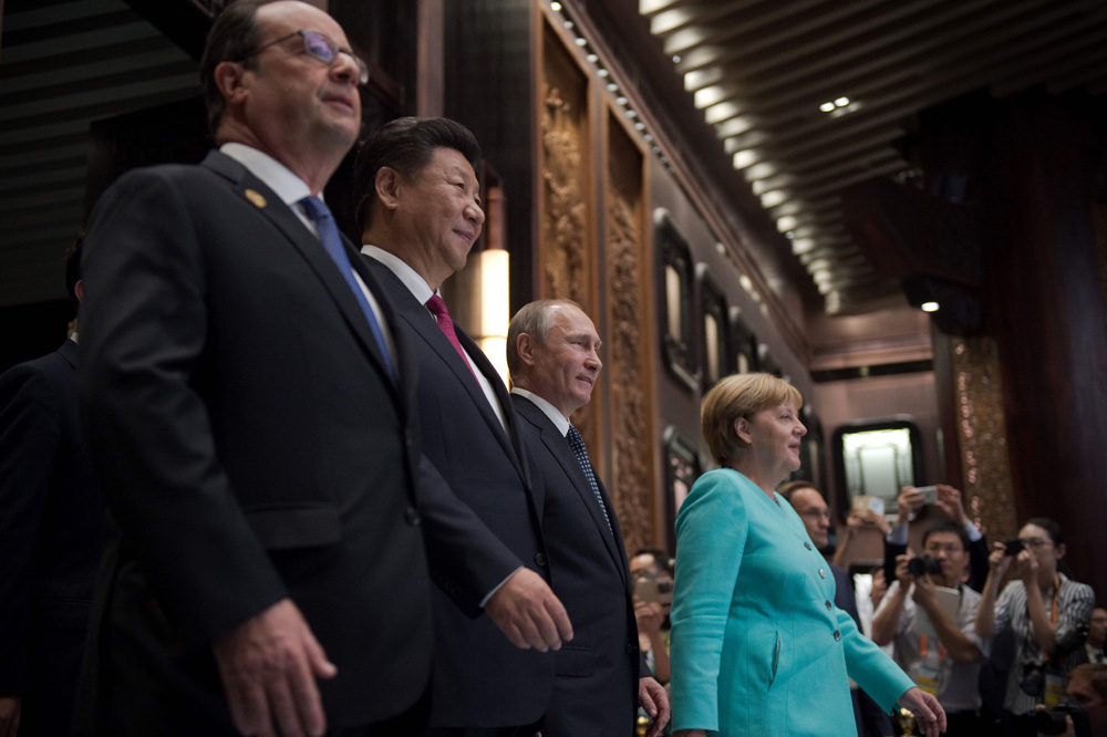 图:中国国家主席习近平(左二)、俄罗斯总统普京(右二)与法国总统奥朗德(左一)、德国总理默克尔(右一)抵达二十国集团领导人杭州峰会开幕式\法新社