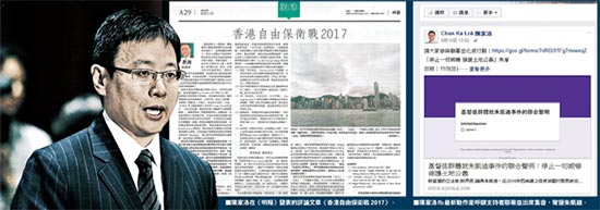 当时陈家洛潜水未有回应本报查询,事隔一个月,他昨天又在《明报》上发表文章,并以《香港自由保卫战2017》为题,劈头就说︰试想像某天一觉醒来,那象征着中国共产政权的五星红旗升不起来了,这个政权真的倒了。领导人和数以千万计的中国共产党员终于肯讲真话承认共产主义是一个世纪骗局......颠覆意图明显。