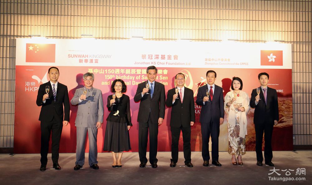 纪念孙中山150周年诞辰暨国庆音乐会于昨晚八时举行。行政长官梁振英、中联办副主任杨建平、外交部驻港副特派员佟晓玲、蔡冠深基金会主席蔡冠深、中山市政协主席丘树宏,以及各国驻港总领事和政商界友好等出席,并于演出前举行简单隆重的祝酒仪式。蔡冠深在祝酒仪式上致辞时表示,孙中山一生追求中华民族复兴,提倡天下为公、和平博爱。他不但是革命家,也是现代经济建设理论的探索者和实践者。孙中山强调敞开国门,吸收和引进世界各国的先进思想、文化、科学、技术、资金与人才,并把门户开放,作为关乎中国命运的基本国策。