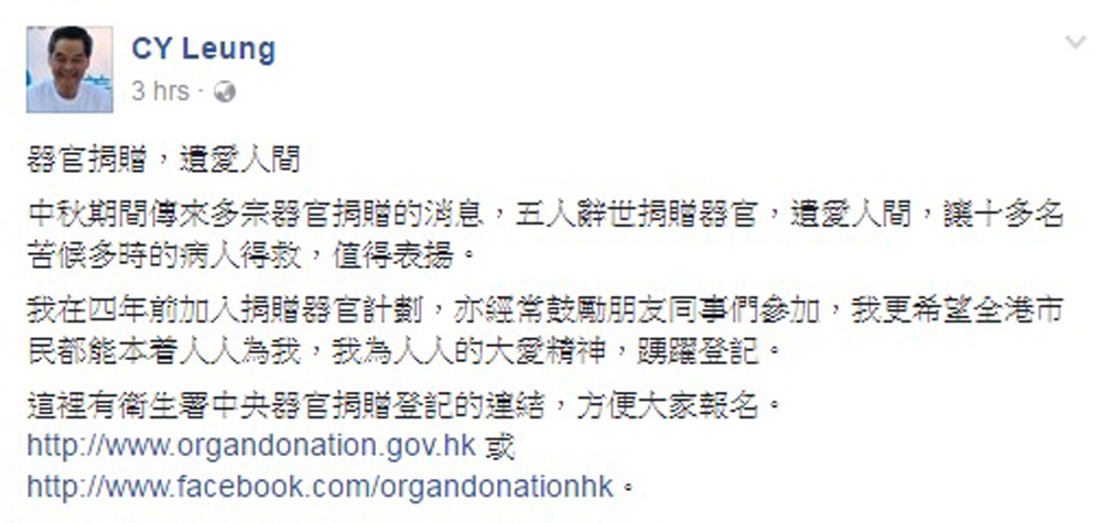 梁振英最后亦于Facebook贴上卫生署中央器官捐赠登记的连结,或,呼吁市民踊跃登记。