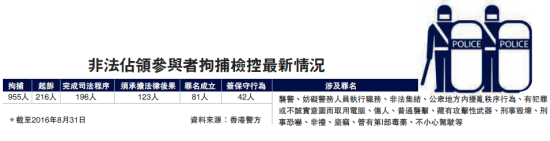 警方发言人表示,截至今年8月31日,共有216人经司法程序处理,196人已完成司法程序,其中81人被定罪,42人须签保守行为(详见附表)。至于涉嫌在事件中扮演主导角色者,警方称调查已于去年三月完成,并已呈交律政司徵询法律意见,其后律政司向警方要求就已呈交的资料作出跟进,警方已就相关要求完成跟进工作,并于今年四月呈交律政司,现正等候进一步法律意见。