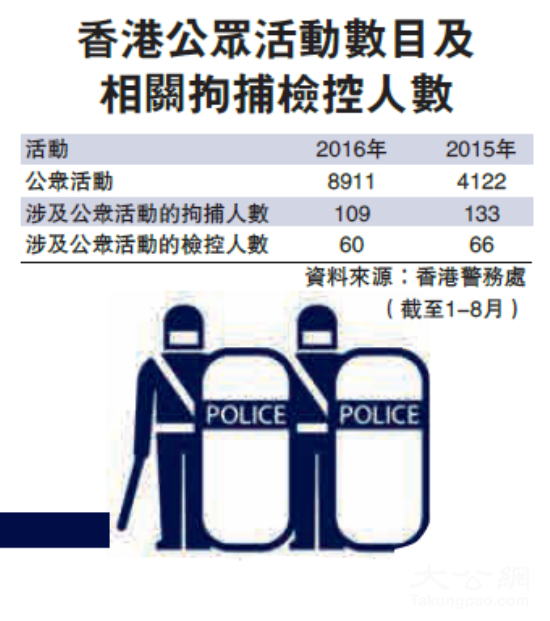 根据警方向《大公报》提供的最新统计,今年首八个月已录得8911宗公众活动,比去年同期4122宗增加116%(详见附表)。警方高层早前指出,今年上半年处理5602宗游行集会,较去年同期升73%,可见活动次数升幅惊人。据了解,此举是有见近年社会政治形势复杂多变,团体和市民大大小小表达意见活动频繁,有需要总部层面加强与发起人的事前沟通,掌握更多规模、诉求,策划行动上更准确调配警力。