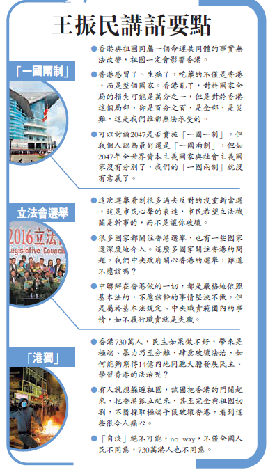 王振民批评,有人认为中国繁荣好像使得香港衰落,遂尝试躲避祖国,把门关起来孤立香港,完全与祖国切割,在香港过小日子,甚至不惜采取极端手段破坏香港,形容情况令人痛心。他表示,香港不是属于几个人,而是属于700万香港同胞、属于全国人民,强调香港与内地本来就是一个统一体,香港‘感冒’了,‘生病’了,吃药的不仅是香港,而是整个国家。王振民又呼吁港人要明白,香港乱了,于国家全局的损失可能是万分之一,但对于香港这个局部来说,损失是百分之百,是一场灾难,谁都无法承受。