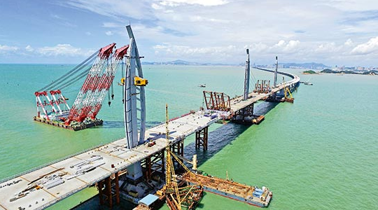 作为目前全球最长的跨海大桥,港珠澳大桥全长55公里,由跨海桥梁、海中人工岛和海底隧道组成。其中,桥梁工程长达22.9公里,除了青州航道桥、江海直达船航道桥、九洲航道桥三座通航孔桥外,深水区15公里采用110米跨径钢箱连续梁桥,浅水区约5.4公里采用85米钢混组合连续梁桥。