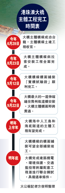 大公网9月23日讯 (记者方俊明)港珠澳大桥主体工程建设迎来新突破。目前,大桥桥梁主体工程的最后一道工序伸缩缝安装正在进行,这意味着,全长22.9公里的大桥主体桥面即将贯通,工程随后全面进入桥面铺装阶段。大桥管理局有关负责人透露,大桥桥面总铺装面积达70万平方米,相当于98个标准足球场,工程量为世界之最。此外,其防水、防锈、防腐等标准要达到120年设计使用寿命,预计最快于明年底铺装完工。