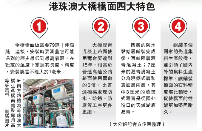 按设计要求,大桥沥青混凝土路面使用寿命要达到15年,这相当于普通高速公路路面使用寿命的3倍。四层的防水黏结层铺装完成之后,要再铺两层沥青混凝土。7厘米的沥青混凝土分为浇筑式层和表面层两层,其中,3厘米的浇筑式沥青是从国外进口的天然湖底沥青,起着不可替代独特作用。目前,大桥首个桥面铺装实桥试验段已顺利完成,预计最快到明年底全部铺装竣工,与海底隧道工程同步具备通车的条件。