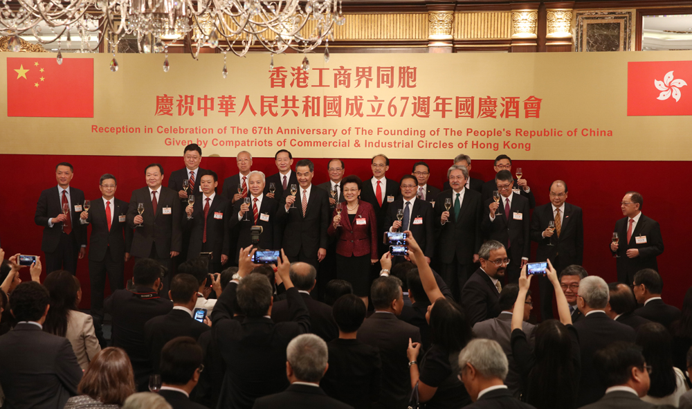 图:行政长官梁振英昨日出席香港工商界同胞庆祝中华人民共和国成立六十七周年国庆酒会。图为梁振英(前排左六)、署理政务司司长张建宗(前排右二)、财政司司长曾俊华(前排右四)、中联办副主任殷晓静(前排右六)、外交部驻港特派员公署副特派员胡建中(前排右五)、香港中华总商会会长杨钊(前排左五)和其他主礼嘉宾一同主持祝酒仪式大公报记者 蔡文豪摄