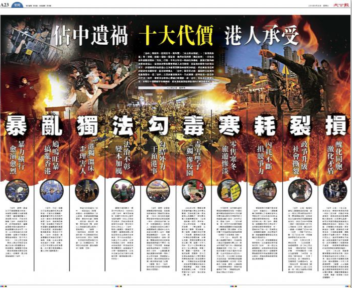 大公网9月28日讯(记者 龚学鸣) 占中两周年,延祸至今。两年间,本土民主前线、香港民族党等港独组织一个接一个冒起,他们主张所谓勇武抗争,衍生出去年冲击游客的光復行动、今年大年初一晚的旺角暴乱,严重打击内地旅客来港信心。香港旅游业和零售业踏入冰河时期,而香港的竞争力亦每况愈下,评级机构穆迪更担心立法会紧张关系未能解决的话,长远为香港信贷评级产生负面影响。直至现时为止,占中头目黄之锋、罗冠聪只是被判社会服务令,但占中三丑依旧逍遥法外。凡此种种,证明香港一直信奉的守法、和平、尊重法治等核心价值已被侵蚀。就占中对香港的种种祸害,本报以十个关键字作为总结,冀本港社会对破坏香港的行为警钟长鸣。