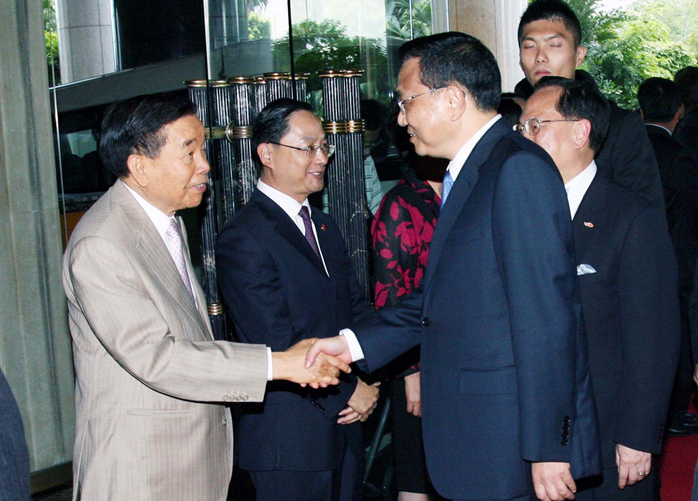图:2011年8月16日,时任国务院副总理李克强(右)访问香港,在下榻酒店与前来迎接的郑裕彤(左)亲切交谈/资料图片