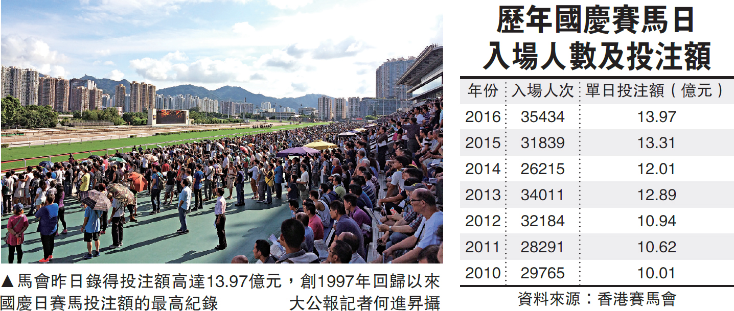 马会表示,昨天国庆日赛马有35434人入场,较去年升约4000人,投注额13.97亿元,较去年升约6000万元。