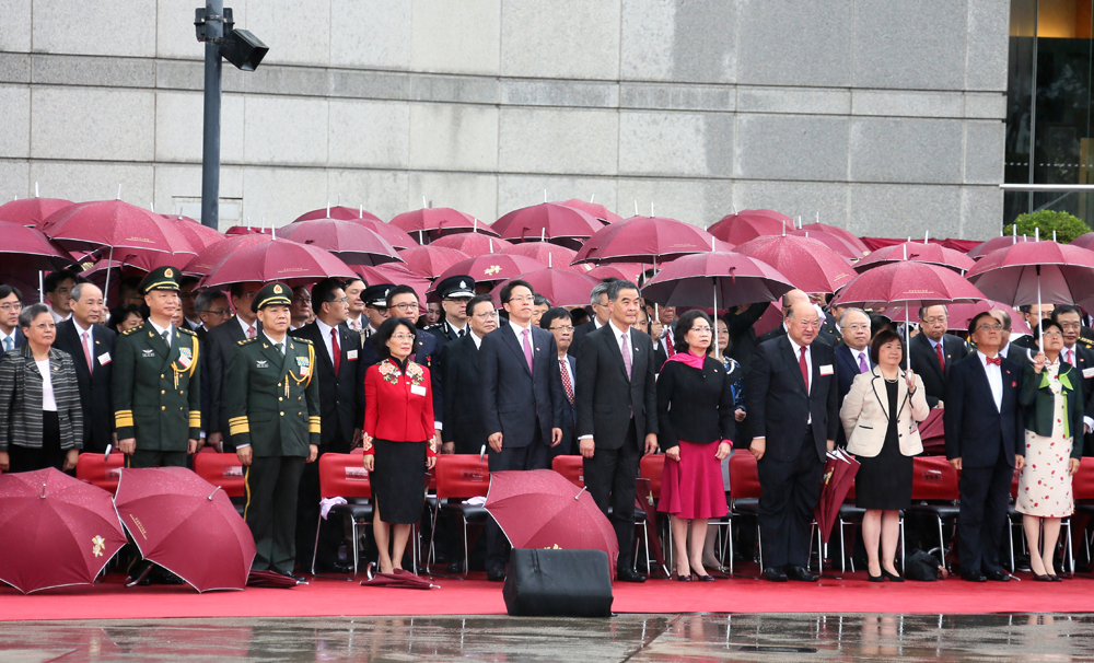 图:行政长官梁振英(前中)、中联办主任张晓明(前左五)等放下伞,冒雨出席国庆升旗仪式/新华社