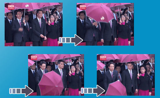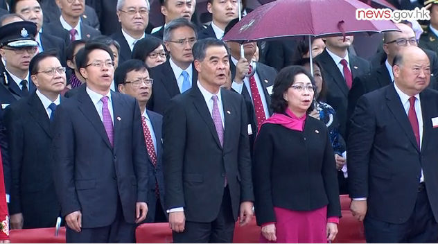 中联办主任张晓明主动放下自己手中的伞,在雨中肃立并向国旗行注目礼。 图:香港电台