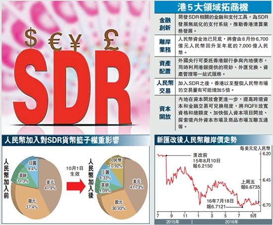 大公网10月3日讯(记者欧阳伟昉)国际货币基金10月1日正式将人民币纳入特别提款权(SDR)货币篮子,成为继美元、欧元、日圆和英镑之后的第五种入篮货币,人民币国际化迈进新里程碑。多位财金界人士近日均指出,作为最大离岸人民币中心的香港,可以在金融创新、离岸业务、资产配置、人民币交易、资本开放这五大领域发挥作用,在人民币入篮后获得更大商机,相信香港离岸市场的作用不会因人民币进一步开放而减弱。