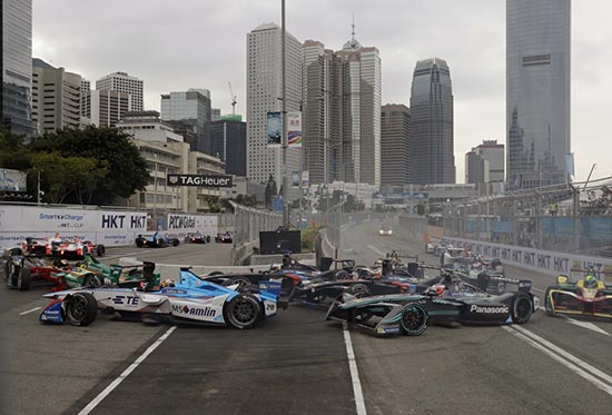 港电动车方程式赛事的参赛车完成第一圈赛程时情景。车手们艺高人胆大,飙车掟弯视如小菜一碟/美联社