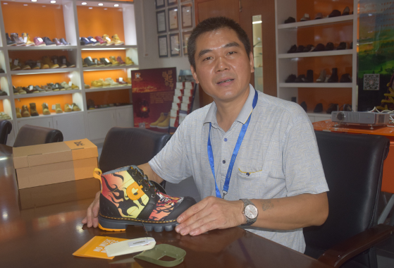 图:港昌鞋业技术开发部主管张贺卫向记者展示其开发设计的新款安全鞋/大公报记者卢静怡摄