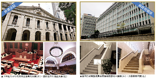 可持续发展是建筑大趋势,活化历史建筑近年在香港成为不少建筑师的考题。建筑署近年先后完成终审法院大楼及中区政府合署东座及中座的复修工程,两位负责工程的建筑署高级建筑师钟鸣昌、劳志成接受《大公报》专访时形容,保育历史建筑的过程有如解题,保留建筑物历史特色、令旧建筑符合新法例要求,以及令旧建筑满足新使用需求,是解题过程需攻克的三大难关,没有标准答案,惟结果一定要情理兼备。