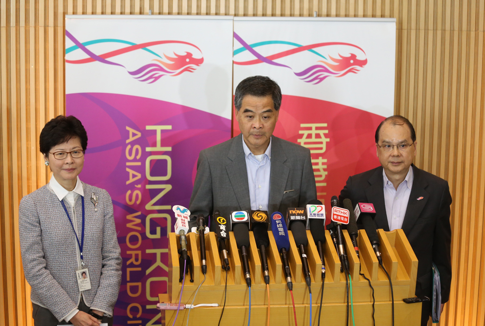 行政长官梁振英(中)表示,政府继续解决长者贫穷问题、努力建公屋及提升社会流动性。图左为政务司司长林郑月娥,右为劳工及福利局局长张建宗/大公报记者 何嘉骏摄