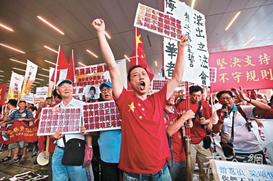 千名市民昨冒雨到立法会请愿,群情激愤,坚决反对立法会接纳辱华宣独的梁颂恒和游蕙祯成为议员,得悉建制派团结采取杯葛行动让梁游二人无法宣誓后,众皆叫好。大公报记者蔡文豪摄