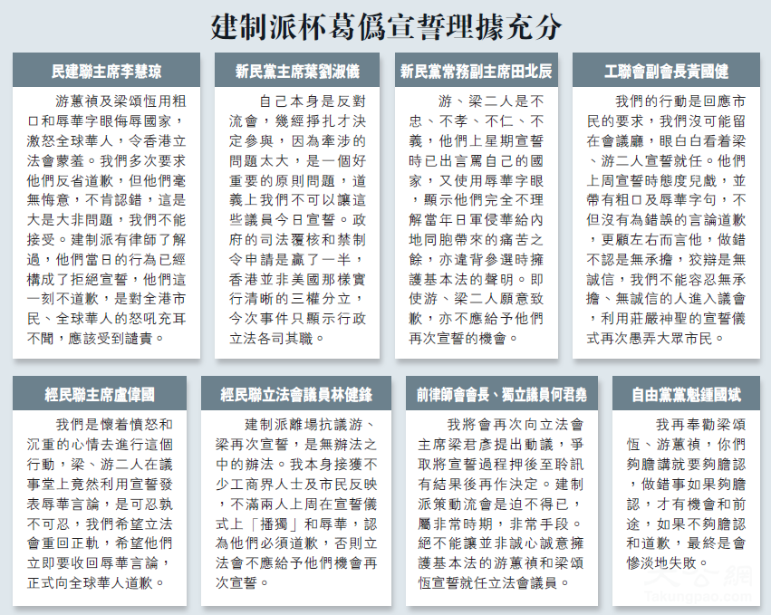 建制派召集人廖长江在见记者时指出,梁游两人上周三在庄严的宣誓仪式上,发表辱华言论,公然违反基本法。兹事体大,安排梁颂恒、游蕙祯昨日再宣誓是不恰当的。过去一周,建制派已给予二人足够的机会公开道歉,但对方仍然拒绝,甚至嬉皮笑脸,以连三岁细路都呃唔到的藉口欺骗市民。廖直言,做人要光明磊落,敢做就要够胆认,做咗都无道德勇气去承认嘅话,系有问题。做人都有问题,唔单只系议员。