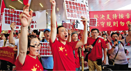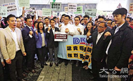 大公网10月20日讯(记者龚学鸣)民建联、工联会及逾三十个民间团体,近千人昨日冒雨到立法会请愿,反对青年新政梁颂恒及游蕙祯再次宣誓。示威者谴责游、梁二人上周宣誓时的支那言论,冒犯中国人及宣扬港独,与基本法抵触,应被视为拒绝宣誓。当立法会内传来流会消息,二人未能完成宣誓时,众人高声欢呼同称痛快。